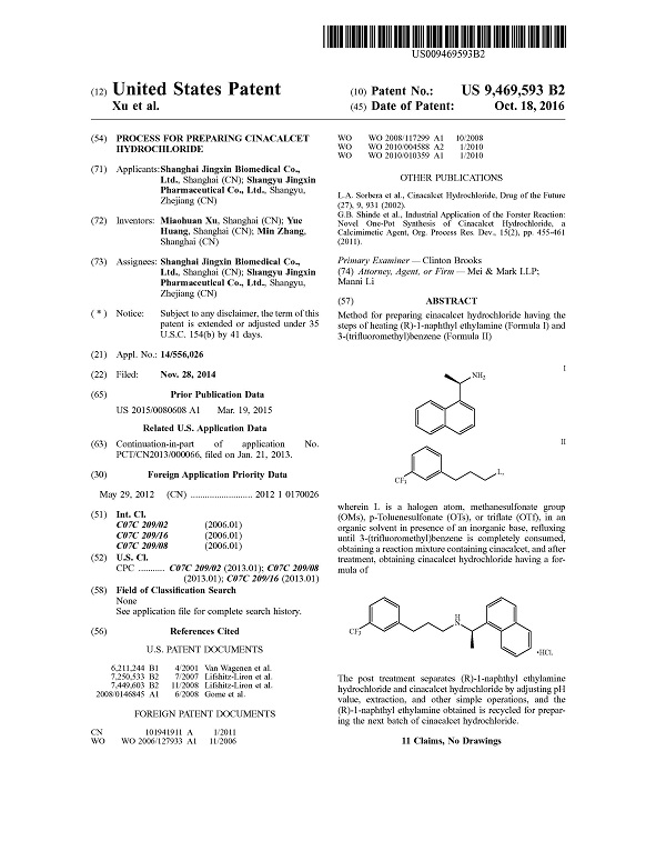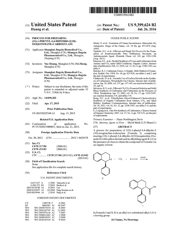 克日,公司的PCT专利申请:PROCESS FOR PREPARING (1S)-1 -PHENYL-3,4-DIHYDRO-2(1H)-ISOQUINOLINE–CARBOXYLATE获得美国专利商标局(USPTO)揭晓的发明专利授权证书。专利授权通告号US9399624,为公司首件通过PCT途径获得外洋授权的发明专利。